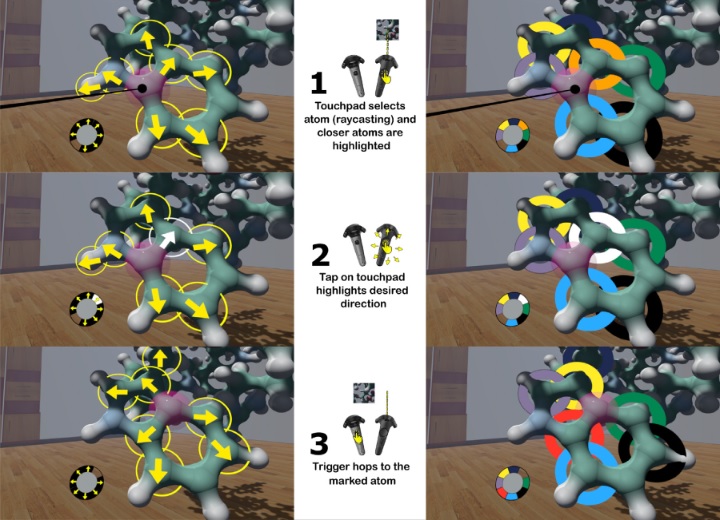 One of the key interactions in 3D environments is target acquisition, which can be challenging when targets are small or in cluttered scenes. Here, incorrect elements may be selected, leading to frustration and wasted time. The accuracy is further hindered by the physical act of selection itself, typically involving pressing a button. This action reduces stability, increasing the likelihood of erroneous target acquisition. We focused on molecular visualization and on the challenge of selecting atoms, rendered as small spheres. We present two techniques that improve upon previous progressive selection techniques. They facilitate the acquisition of neighbors after an initial selection, providing a more comfortable experience compared to using classical ray-based selection, particularly with occluded elements. We conducted a pilot study followed by two formal user studies. The results indicated that our approaches were highly appreciated by the participants. These techniques could be suitable for other crowded environments as well.