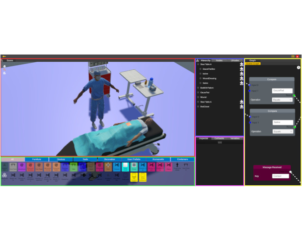 Virtual Reality (VR) has proven to be a valuable tool for medical and nursing education. VR simulators are available at any time and from anywhere, and can be used with or without faculty supervision, which results in a significant optimization of time, space, and resources. In this paper we present a highly-configurable session designer for VR-based nursing education following the Standards for QUality Improvement Reporting Excellence: SQUIRE 2.0 and SQUIRE-EDU. Unlike existing platforms, we focus on letting educators quickly customize the training sessions in multiple aspects. This is achieved through the use of a visual editor, where educators can choose the environment and the elements in the session, and a node-based visual system for programming the behavior of the sessions. Thanks to end-user customization, educators can develop different variants of a session, adapt the sessions to new nursing protocols, incorporate new equipment or instruments, or accommodate custom environments. We have implemented the designer and tested it on various nursing training scenarios. The designer can be integrated into VR simulators to help educators save time in delivering highly customizable training.